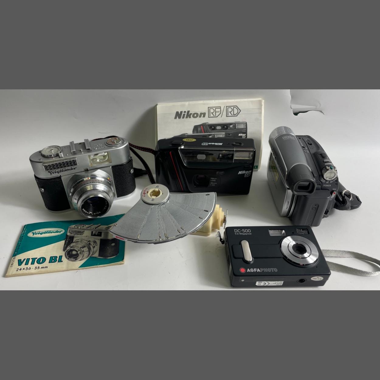 A selection of cameras to include a vintage VOIGTLANDER VITO BL camera with case and booklet also a camcorder etc
