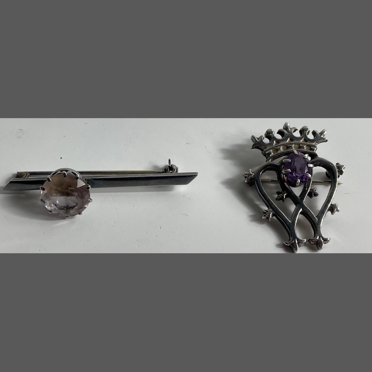 Two hallmarked brooches, the one is a LUCKENBOOTH style with amethyst coloured stone 4cm long gross weight 7.9g, the other a BAR brooch with pinkish stone is 5cm long gross weight 5g