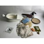A real mixed decorative box to include (34cm long)a decorative flat iron on a stand (17cm high approx), a three-volume encyclopedia of MOTORBIKES, a set of 6 PORTUGUESE ESPRESSO glass (7cm high) plus 2 others, a wooden wall-hanging mallard, some handcrocheted doilies etc, a large ceramic chamber pot, a clay teddy bear ready for painting (approx 20cm tall and weighs a tonne) etc