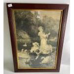 A large Victorian boating scene with a mother and two children with swans on a river picture by Fred Morgan dimensions 2ft x 32"