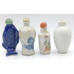 FOUR ANTIQUE ORIENTAL CERAMIC SNUFF BOTTLES, one painted with horses 7cm approx., two decorated with people approx. 7cm, and one in the form of a fish,(RARE) 8cm.