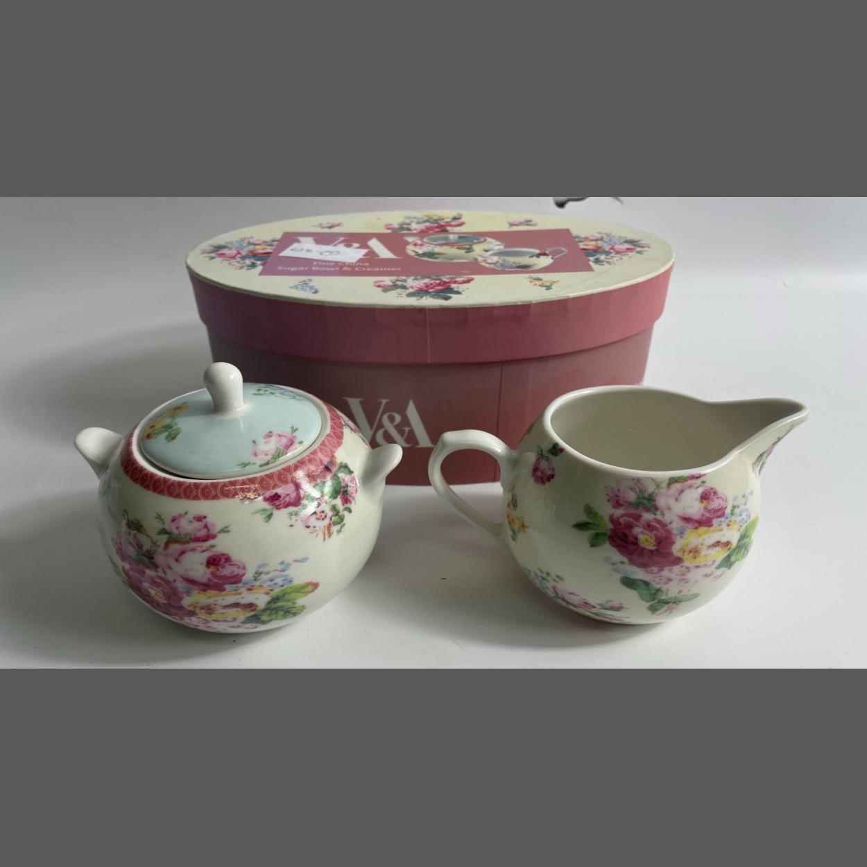 A V&A Victorian sugar bowl and creamer in their original presentation box.