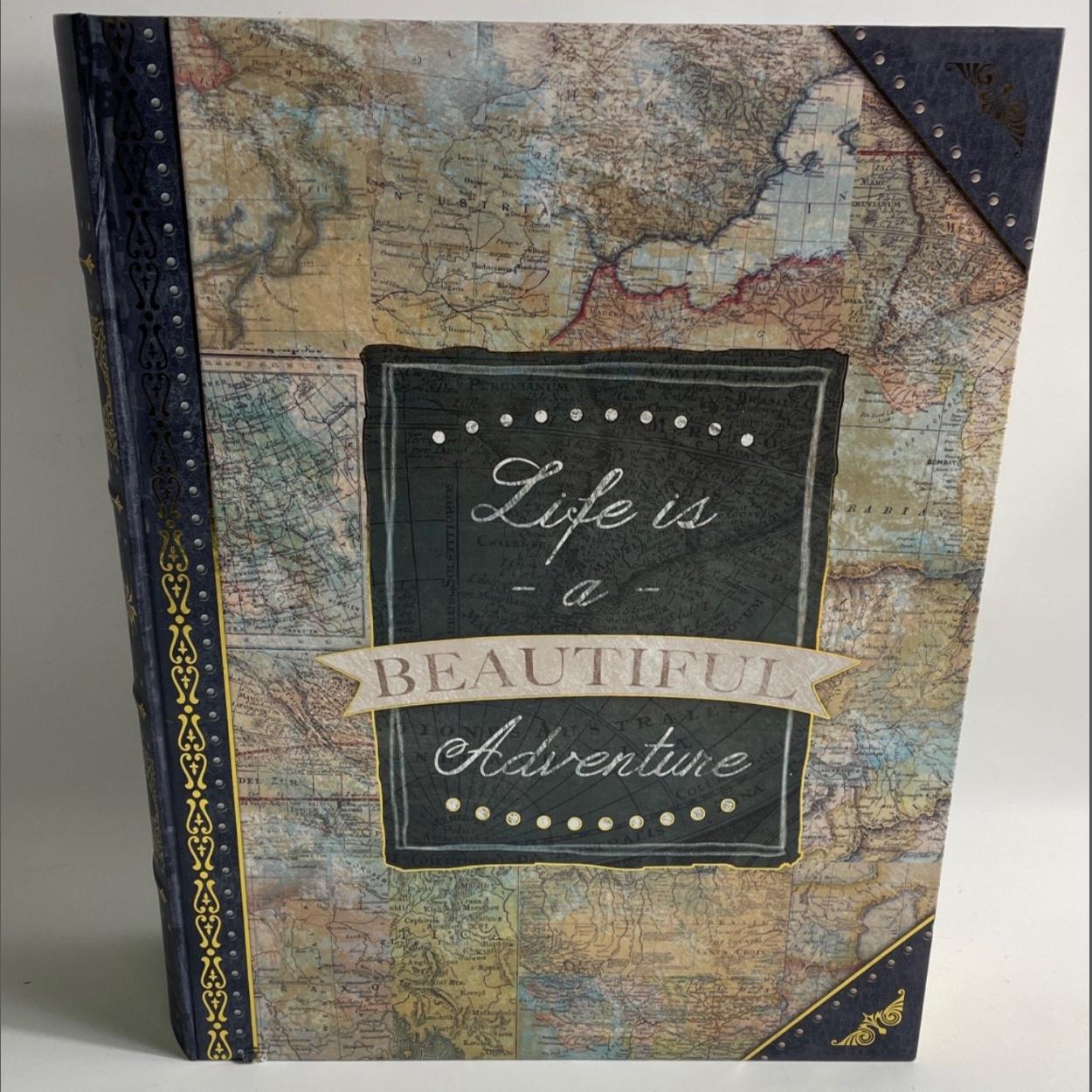 Document storage disguised as a large decorative covered book with the title 'Life is a beautiful adventure' , will safely store A4 sized papers