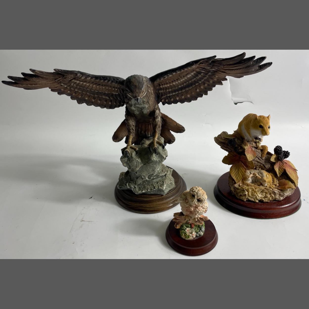 Three statuettes to include a Border Fine Art baby owl (approx 8cm tall), 2 doormice (approx 15cm tall) and a bird of prey signed by "AG" standing approx 23cm high
