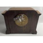 An oak veneer EDWARDIAN enamel faced mantle clock with a French Movement, requires some tlc 25cm high x 36cm wide