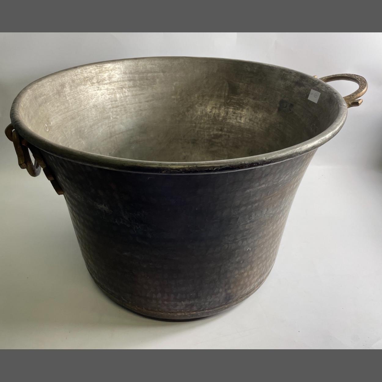 A GINORMOUS POT, copper lined with tin and attractive brass handles, stands approx 40cm high with a diameter of 60cm