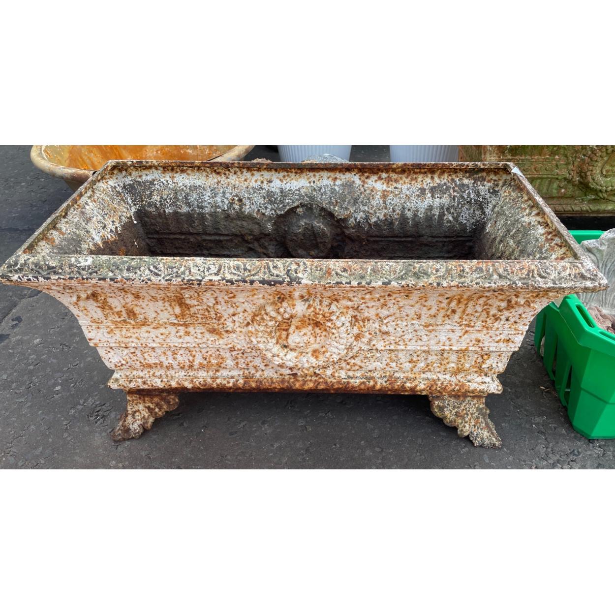 RARE! A VICTORIAN rectangular cast iron garden trough with raised wreath motifs pattern and leaf form feet 72cm long x 35cm wide x 36cm high