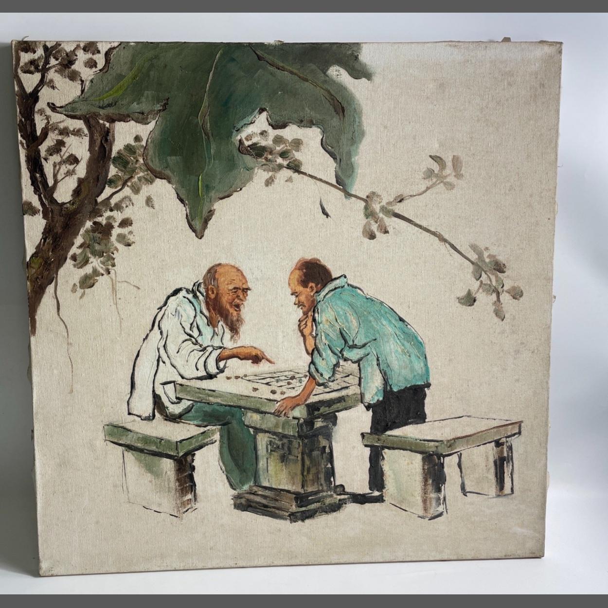 An old canvas painting featuring two CHINESE rural old men playing chess dimensions 2ft square