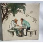 An old canvas painting featuring two CHINESE rural old men playing chess dimensions 2ft square
