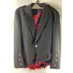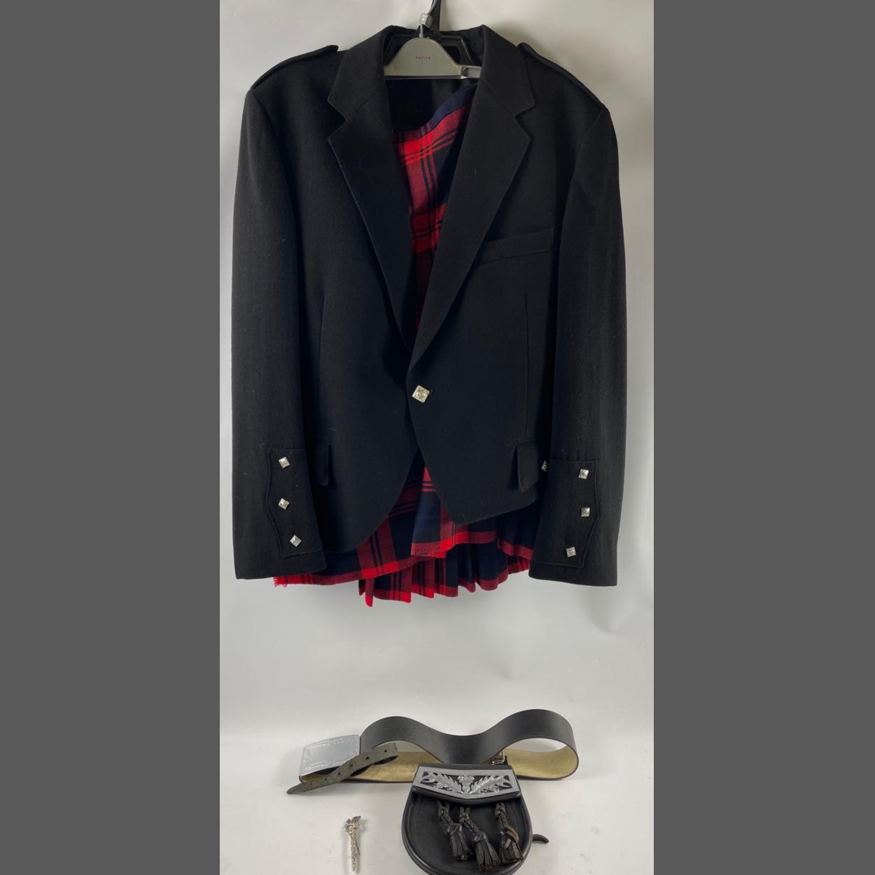 Formal Scottish Wear - a kilt, (waist 80cm adjustable, length 62cm) by Jean O'Rourke, Longniddry, jacket (chest approx 100cm) by Geoffrey of the High Street Edinburgh, belt (95cm approx), flashes and kilt pin