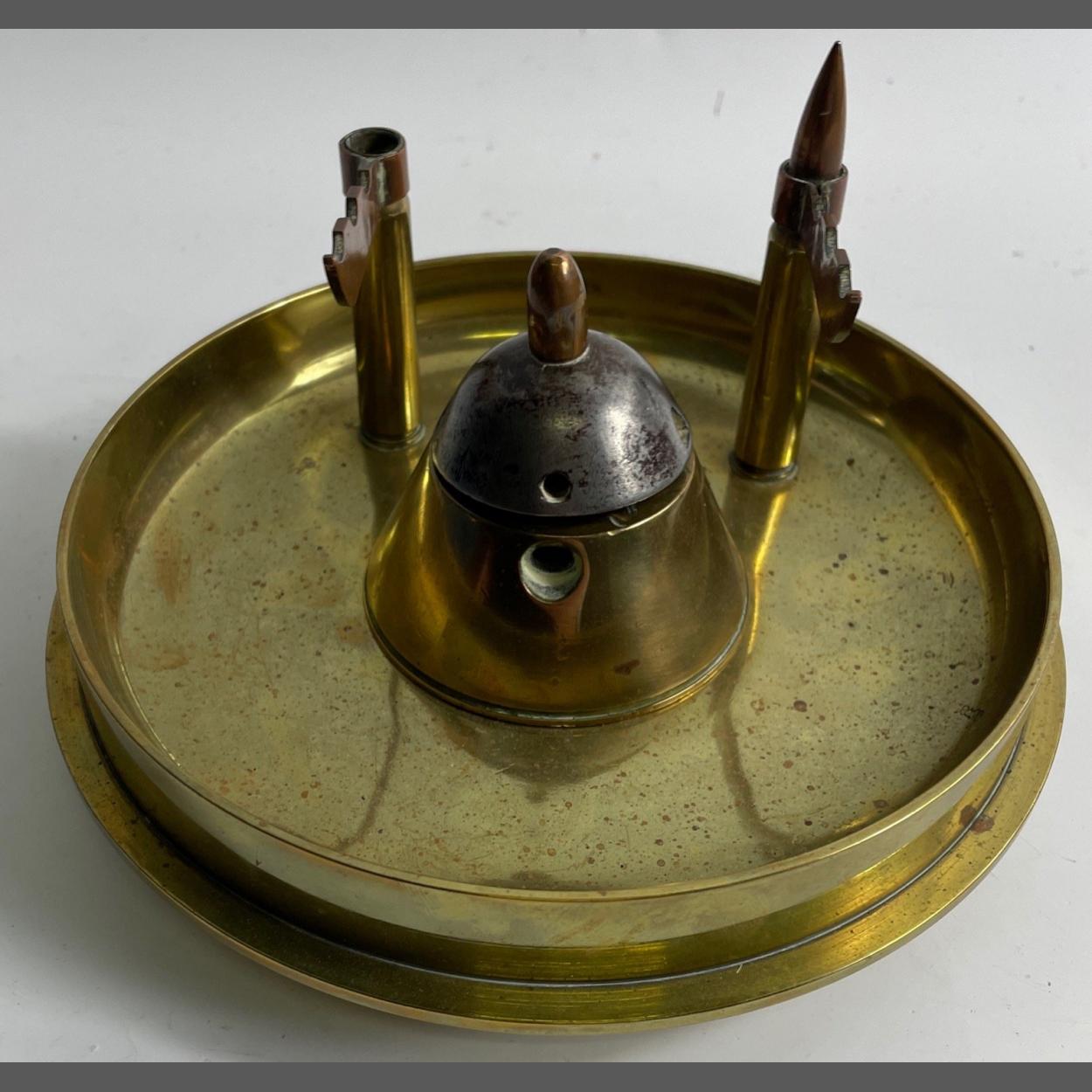 An example of a TRENCH ART pen stand and inkwell (approx 16cm diameter). There is some damage to it but it remains an interesting object
