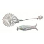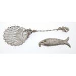 A vintage white metal intricately designed spoon, length 15cm weight 13.20g, with an articulated white metal fish length 6.5cm weight 10.5g approx and lastly a decorative yellow metal wire-work tree - Really Pretty! dimensions 18cm width, 12cm height approx