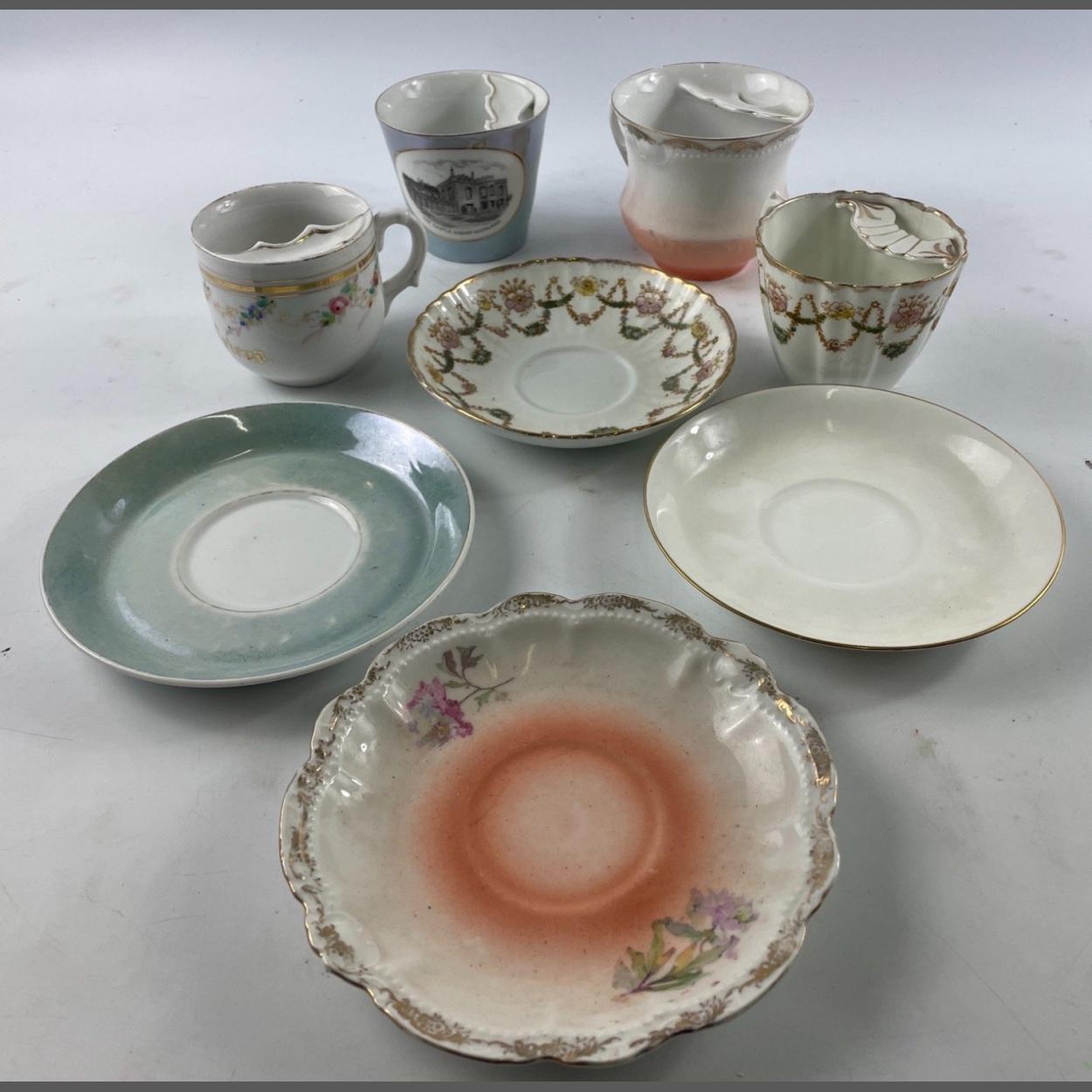 Collection of MOUSTACHE CUPS with saucers, floral bunting style by Park Place, luster sea green marked made in Germany, gold banded marked 'From a friend' and peach based with gilt highlights