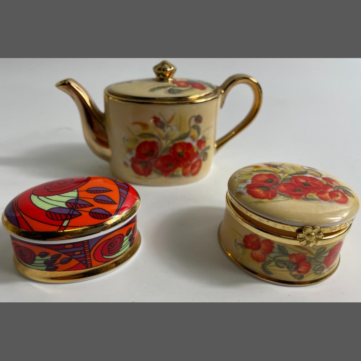 A fine bone china hinged AYLSFORD "POPPIES" PILL BOX (3cm high approx) with a matching miniature teapot (approx 5cm tall) and a small pill box (approx 3cm high) from the "ROSE PETALS" series produced by the MUSEUM COLLECTIONS