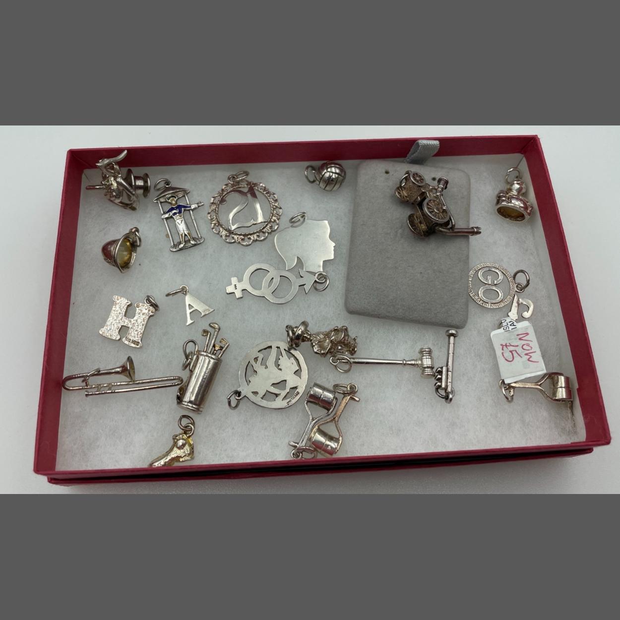 20+ Small Silver charm collection - some unusual football, steam engine, golf bag, trombone etc. All excellent condition