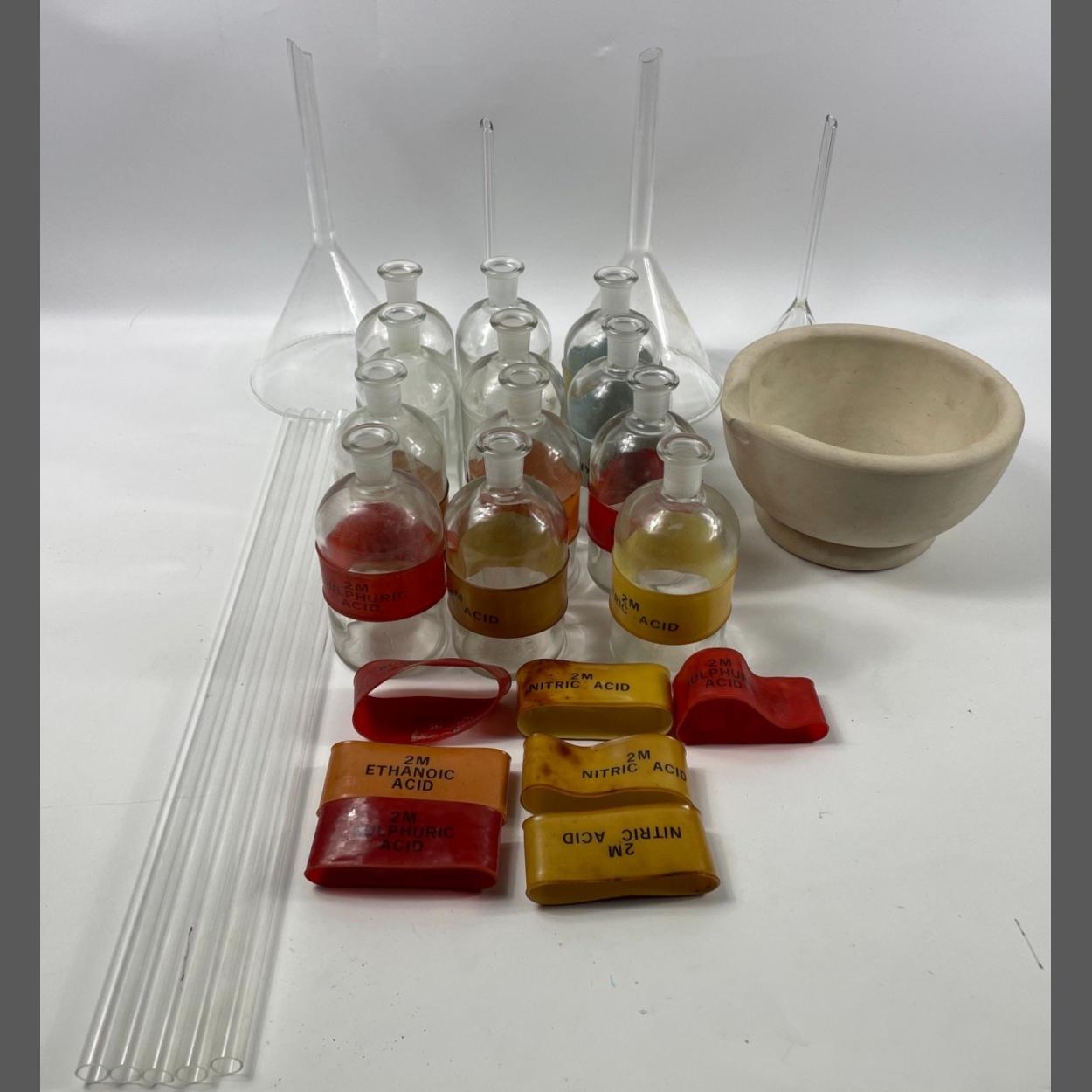 Box of 12 chemistry bottles and glassware to include 13mm glass tubes, various sized funnels etc