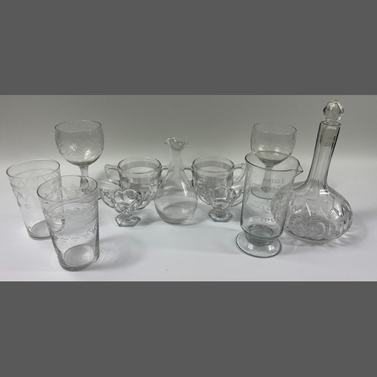 Quantity of cut glass and crystal, to include two small decanters 2 wine glasses and 2 tumblers etc