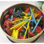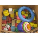 Box of vintage wooden building bricks together with a Fuller's Dundee cake tin full of early plastic construction pieces etc. and SUBBUTEO mat with two goal posts and some team players and balls