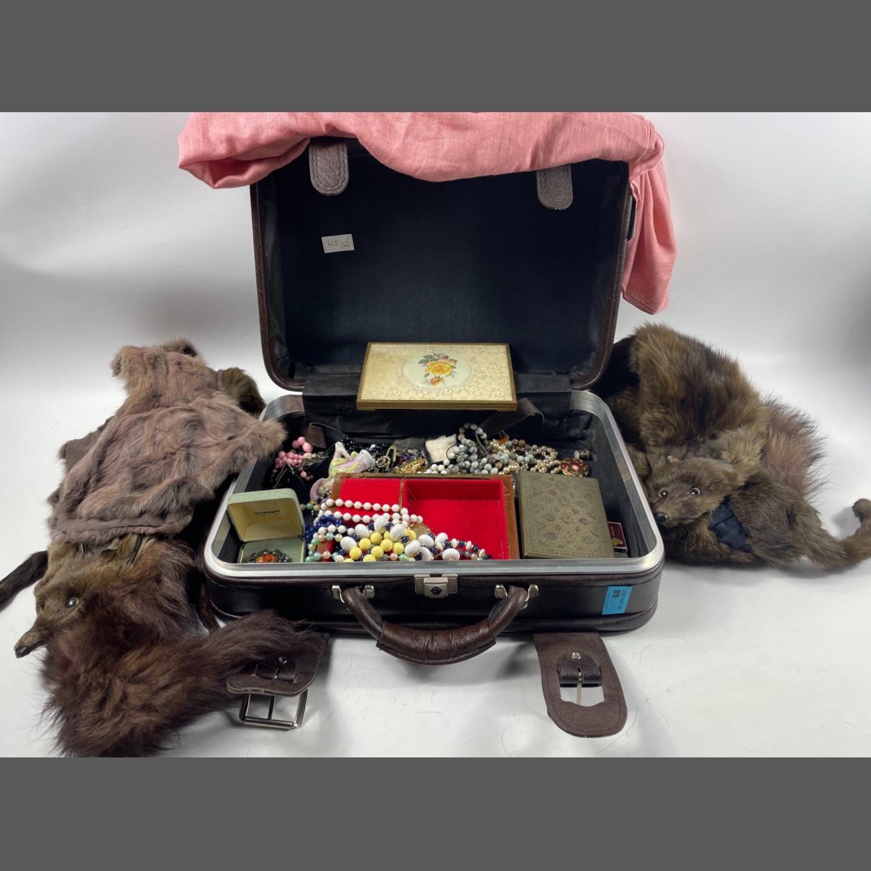 A VINTAGE treasure trove of costume jewellery. including two jewellery boxes 1 damaged, an enamel brooch with purple and blue flowers and another with reds and greens. A boxed HEATHERGEM broach, a pink wool and cotton shawl with original SamBrown Label.also a pretty china ladies dolls head.