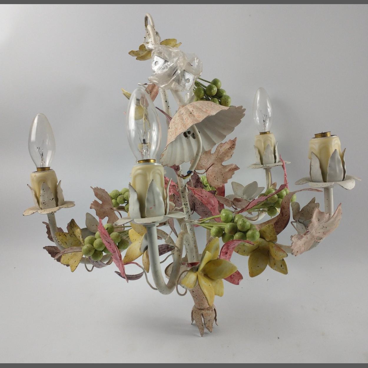 A colourful, highly decorative CEILING PENDANT light with 5 candle bulbs and swags of flowers and leaves