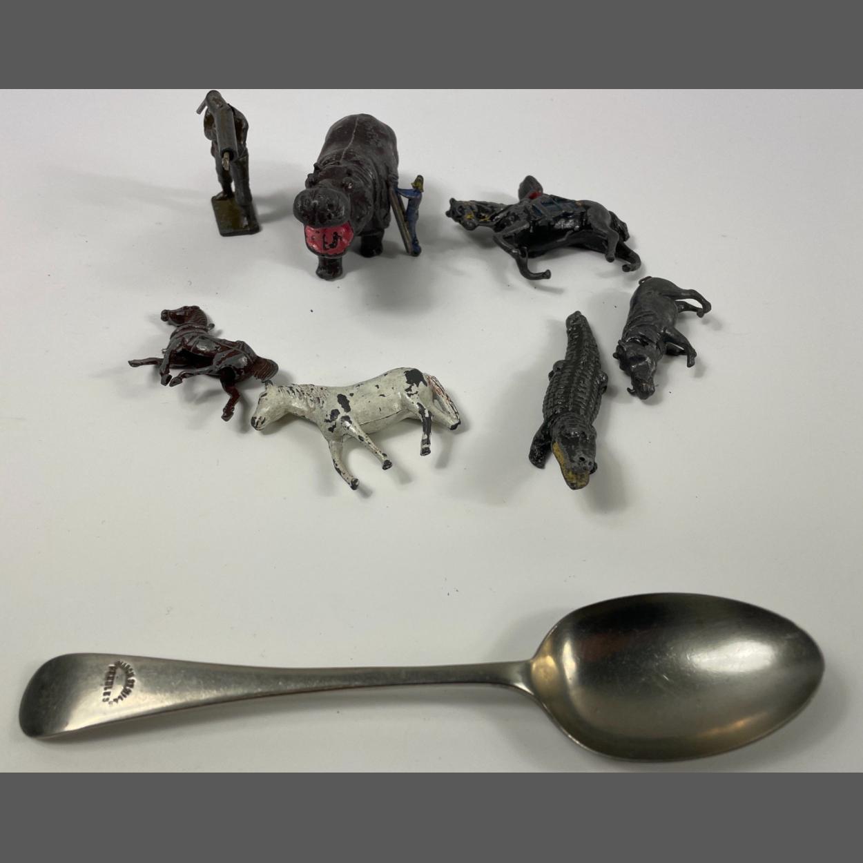 LOCAL INTEREST LOT ! Small collection of 7 vintage lead animals including a crocodile and a hippo A/F plus a memory of Peebles - a dessert spoon from the March Street mill canteen