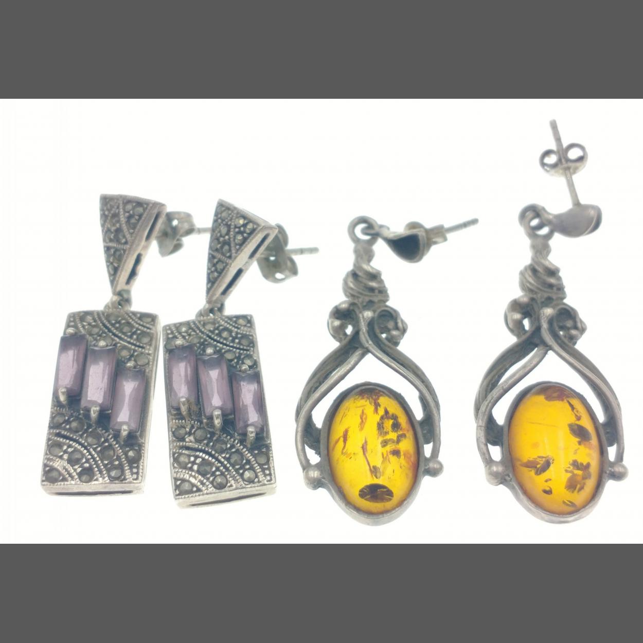 Two pairs of silver earrings - one pair drop stamped 925, marcasite with three amethyst -coloured stones (3cm drop gross weight 12.35g), the other pair stamped 925 with amber-coloured stones (4.5cm drop gross weight 8.2g)