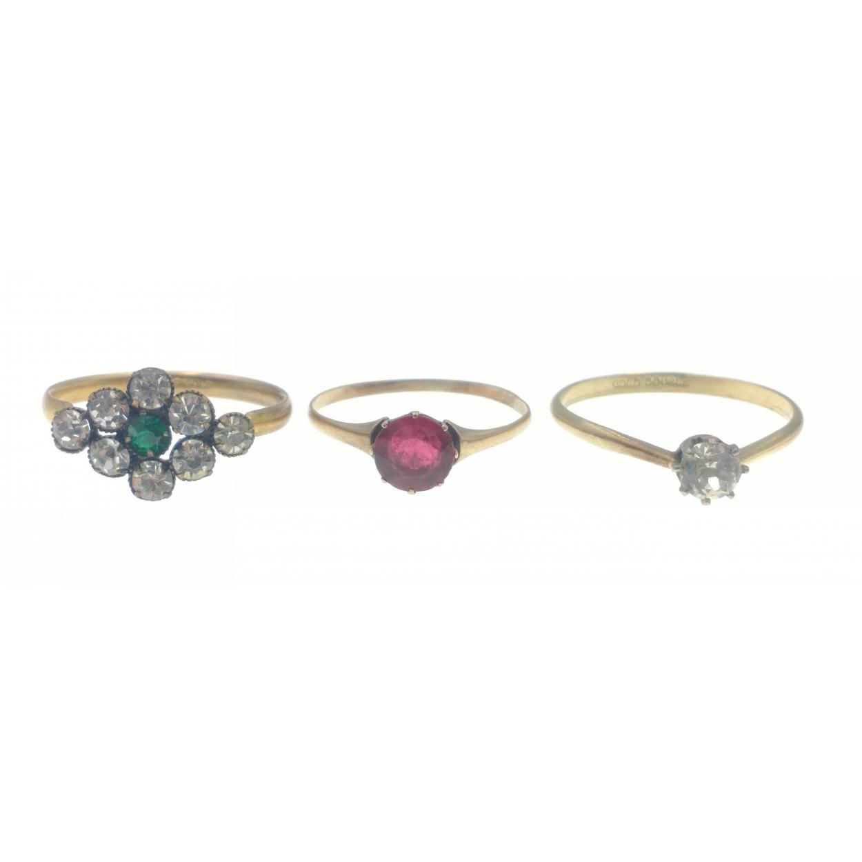 A TRIO OF RINGS to include one stamped Rolled Gold with diamond setting with green and white stones, ring size O, the second ring stamped 'Gold Double' , set with a single clear stone ring size Q, Third ring 'Yellow metal' set with a red stone, gross weight total 3g approx
