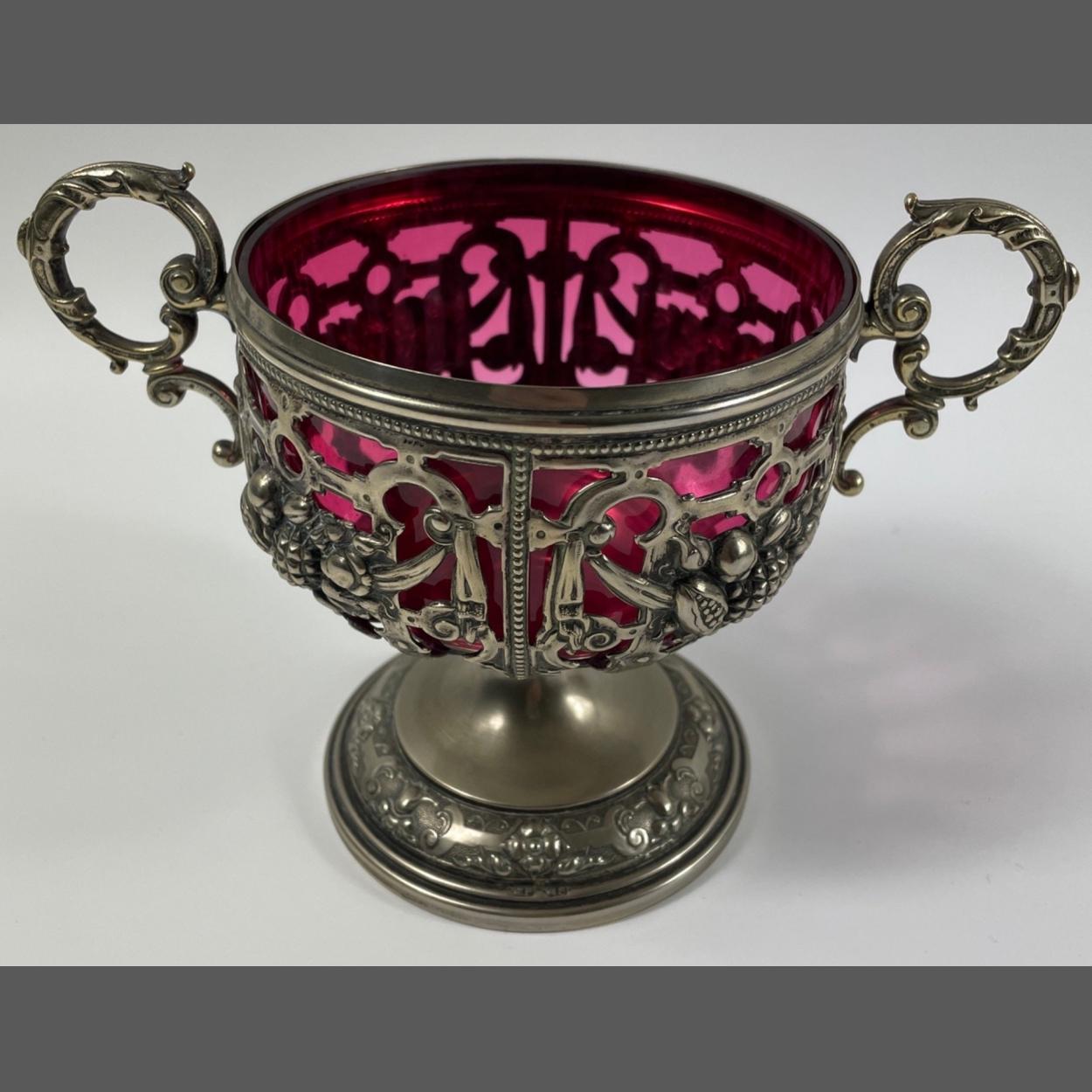 C1940's A twin handled white metal designed fruit cup with a CRANBERRY GLASS glass liner dimensions 17cm diameter x 13cm height