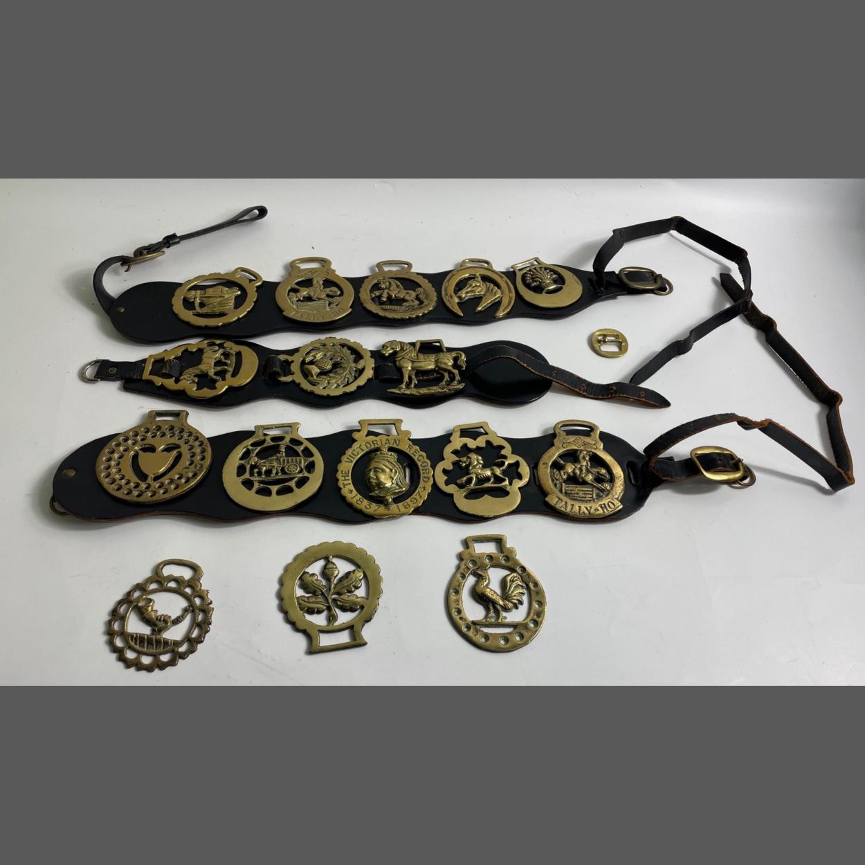 A collection of brass and some leather vintage and more recent horse brasses to include Queen Victoria, cockerel , thistle etc etc etc