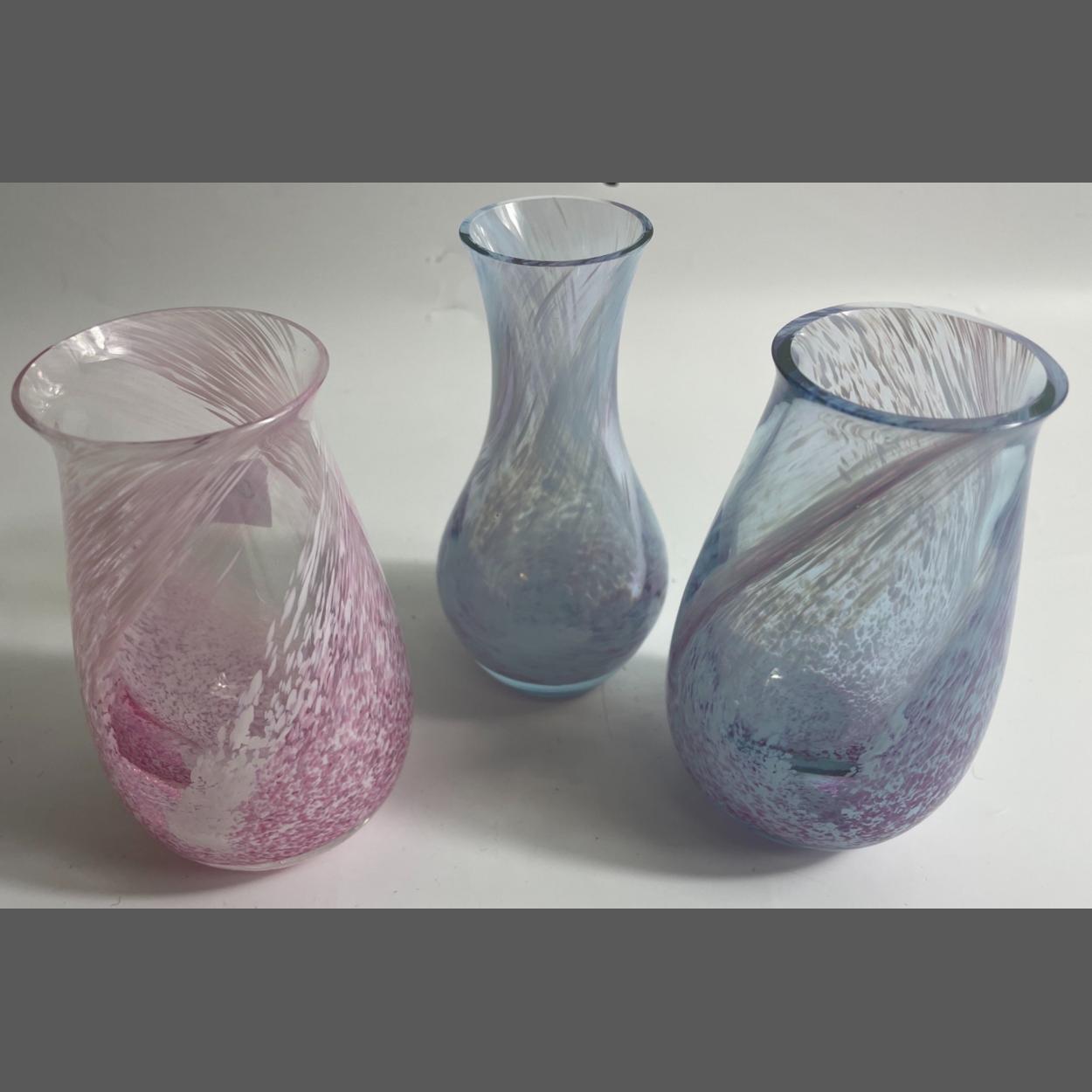Three CAITHNESS inspired vases in swirly white and pinkish colour pattern 12cm tallest item