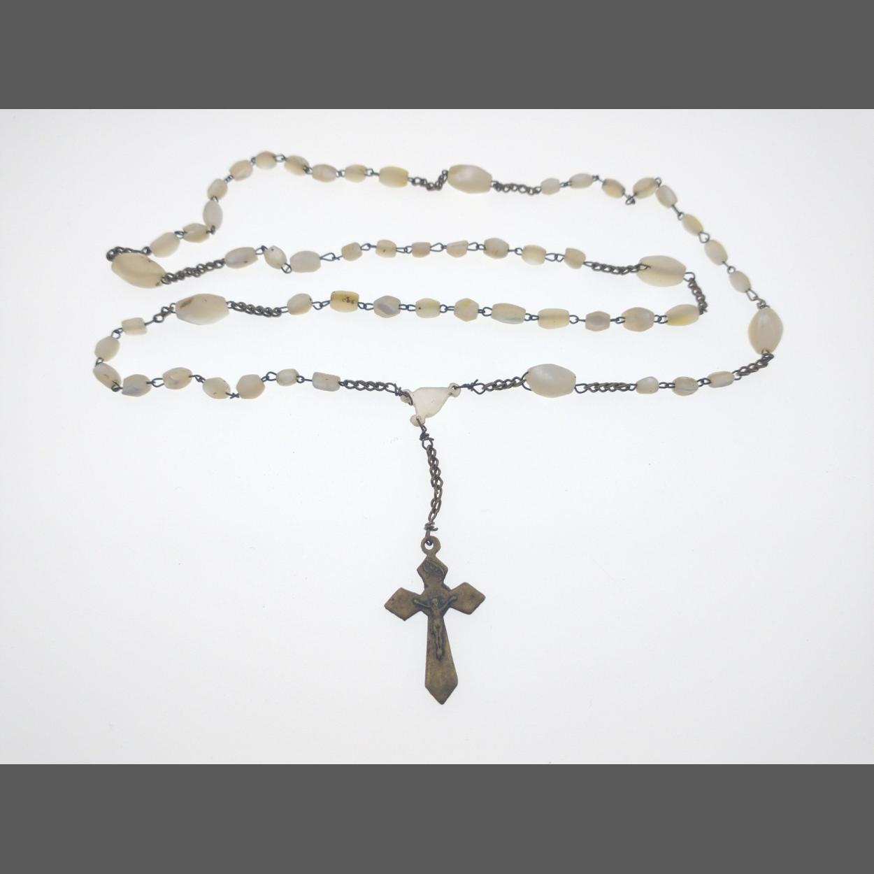 A VINTAGE USA made set of Mother Of Pearl ROSARY BEADS with a yellow metal crucifix 36cm length (doubled-up)