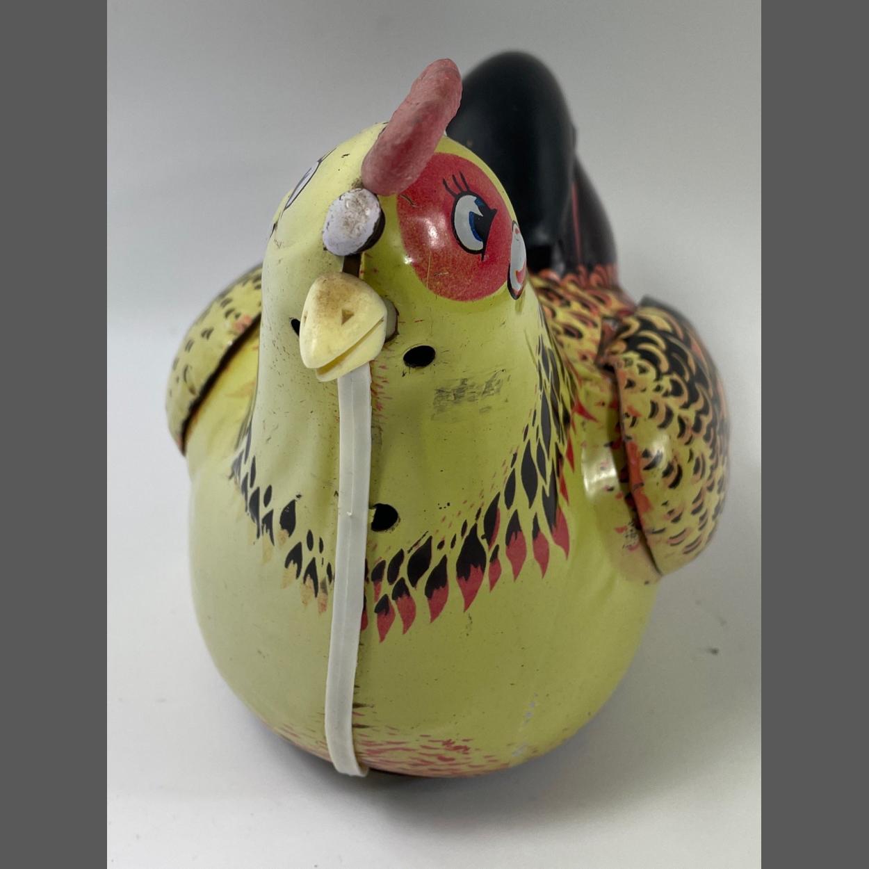 A vintage tin EGG-LAYING CHICKEN made by QSH of China, comes with 4 eggs approx 16cm tall