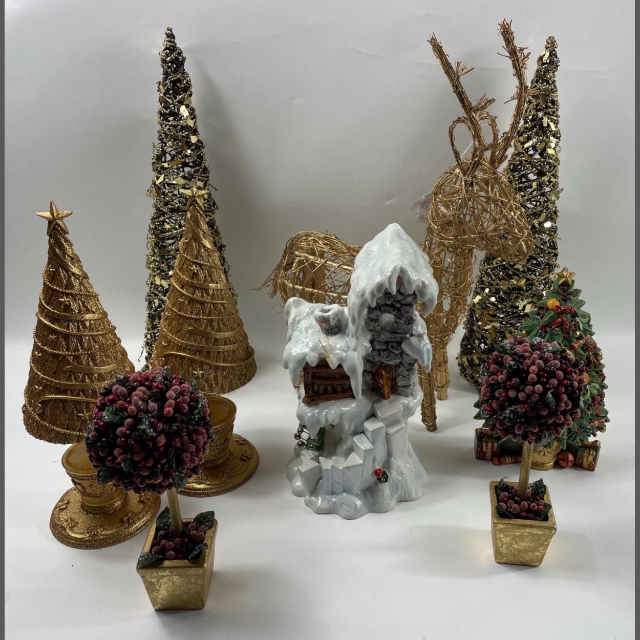 A nice selection of CHRISTMAS ORNAMENTS to include an M&S wall plaque, a DORR EDDY model of the house at the NORTH POLE stands 28cm tall, a pair of conical Xmas trees standing 46cm high, a wicker reindeer and much more
