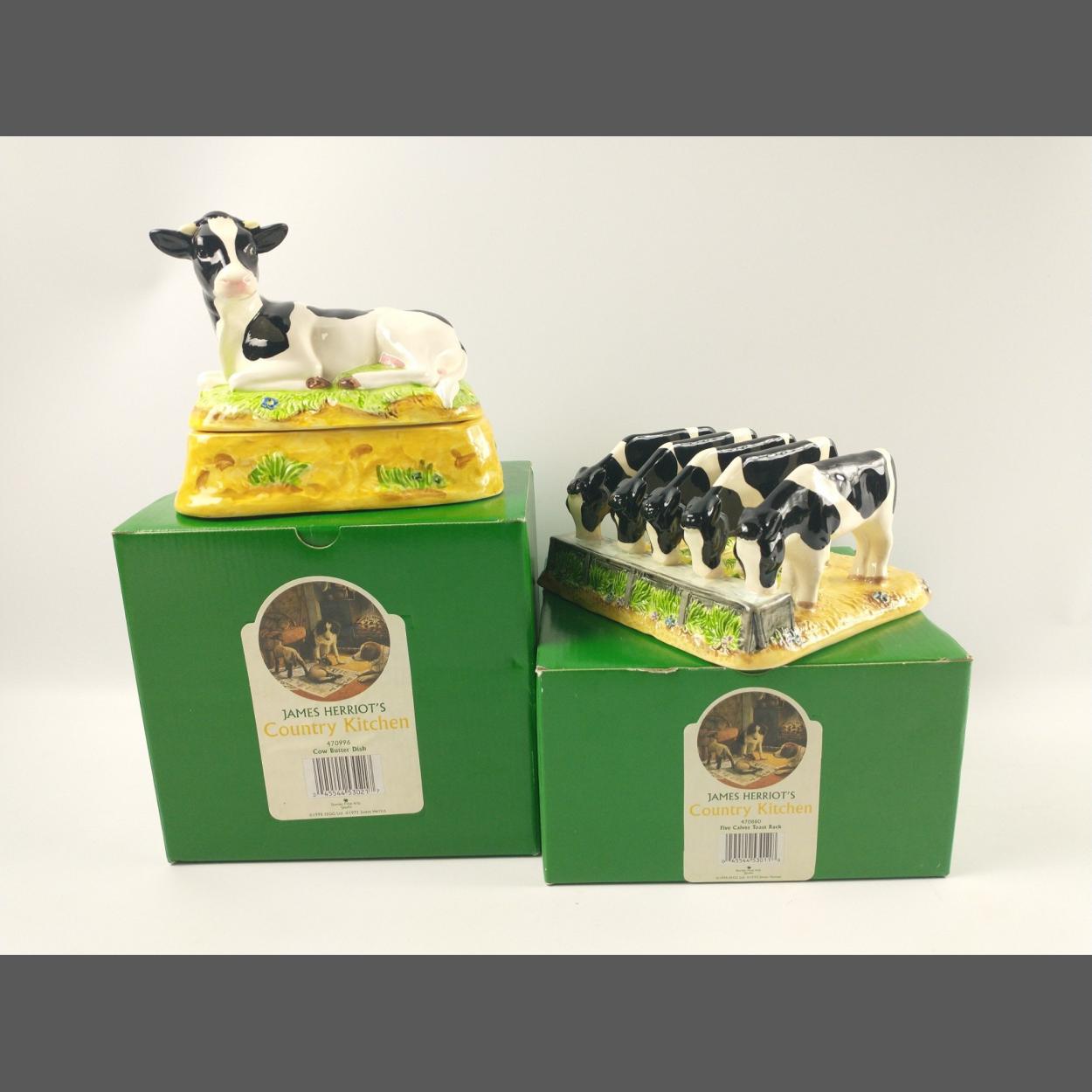 Two pieces of JAMES HERRIOT'S COUNTRY KITCHEN WARE - a cow butter dish (470996) and a five calves toast rack (470880), both undamaged in original boxes