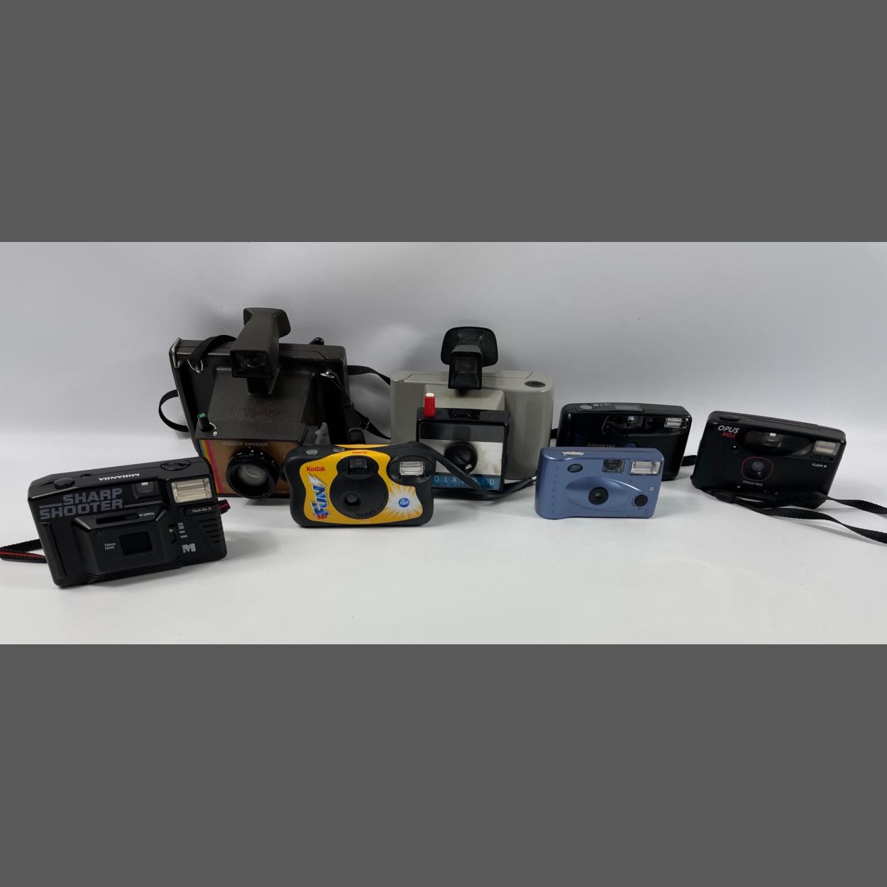 A small collection of cameras to include POLAROID Swinger ll land camera, a POLAROID colour swinger land camera, an OPUS MD2, a GOLDLINE A750000 Mini camera plus others
