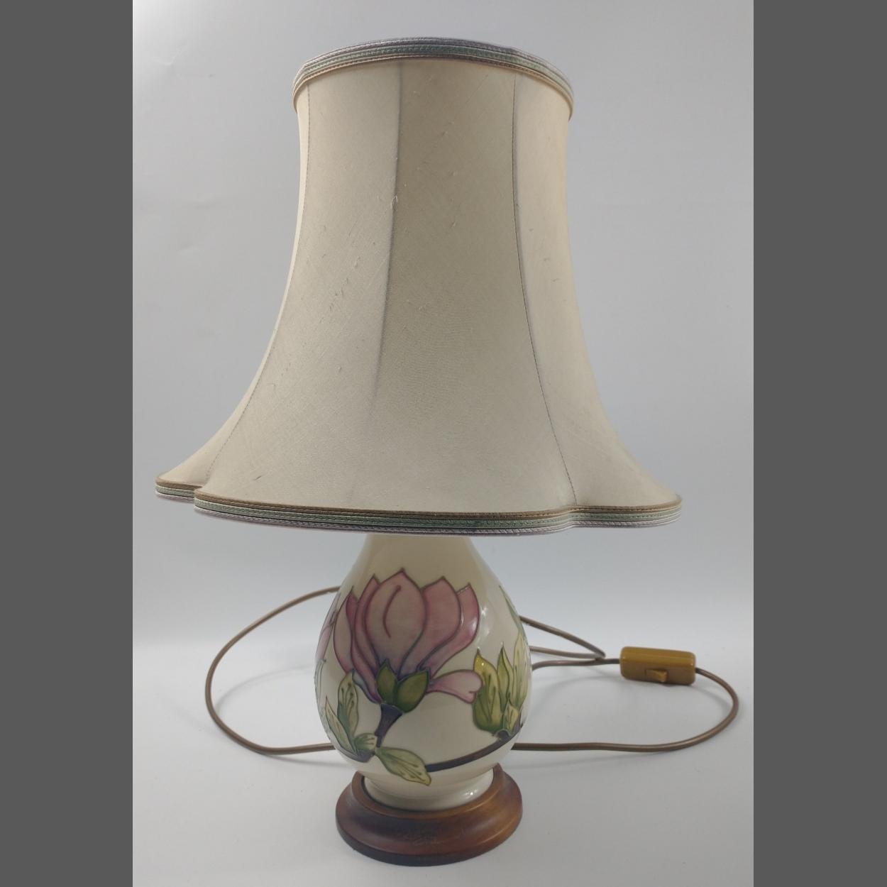 A nice MOORCROFT MAGNOLIA table lamp with a cream base and pink magnolias, also includes a shade.