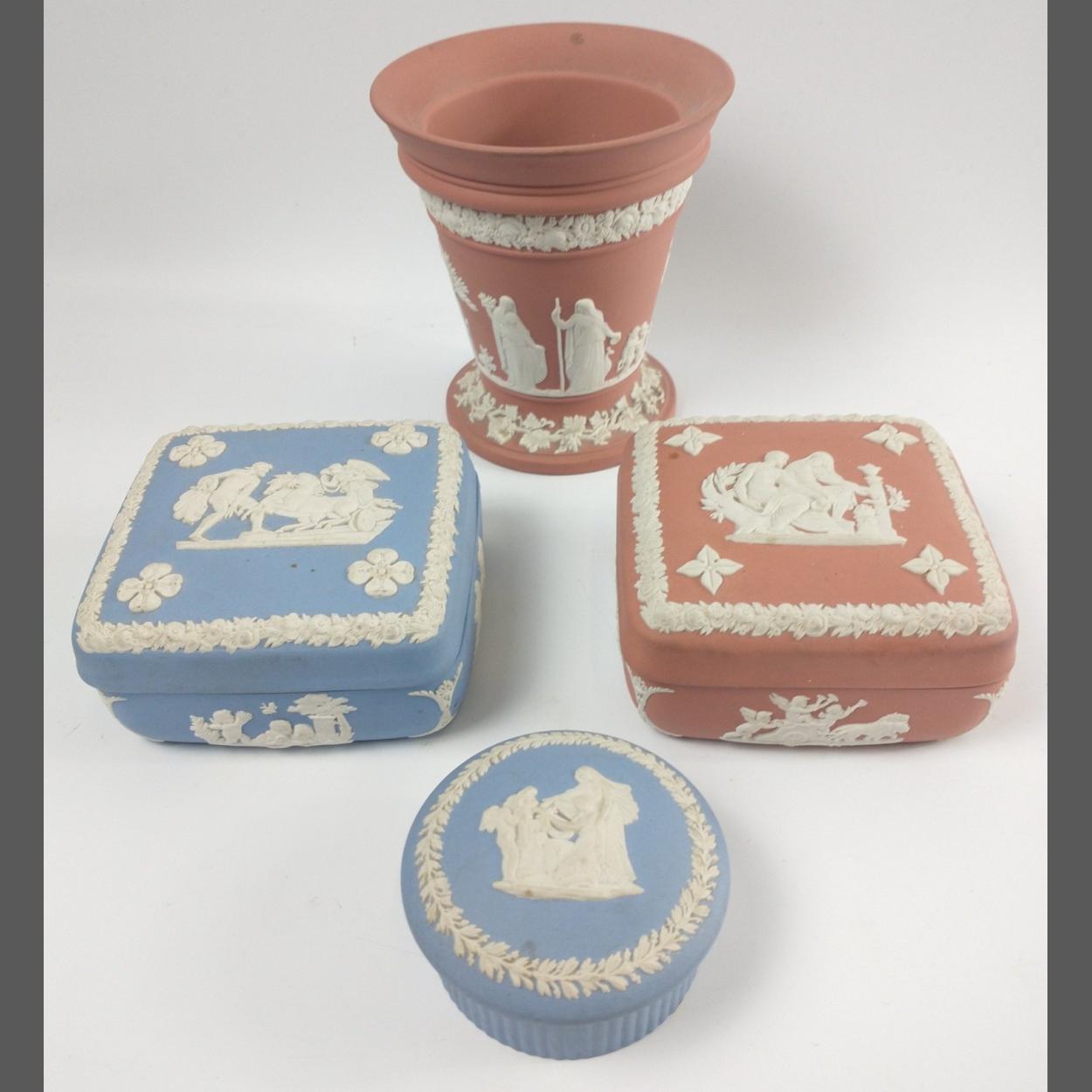 Two pieces of square Wedgwood Jasperware with lids, one piece blue and the other terracotta.[10cm square x 5cm deep ] and one circular blue piece and also a small Terracotta Jasperware vase 12cm tall