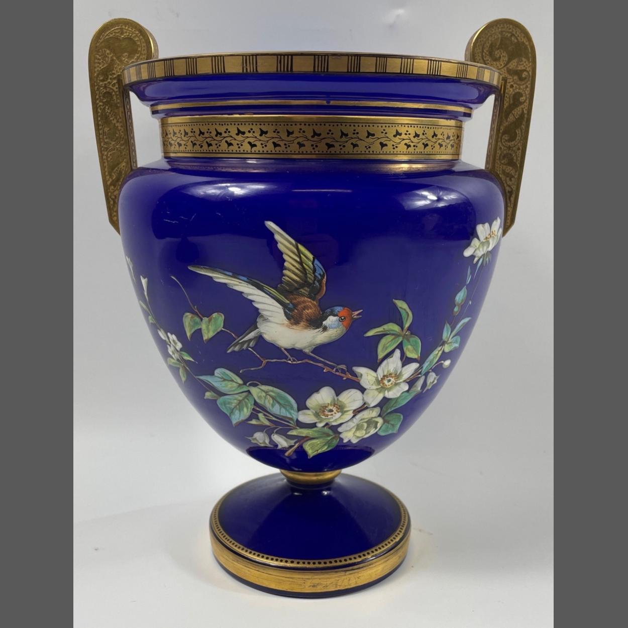 Very Nicely Hand Painted ANTIQUE Blue glass Urn shaped vase, with gilded handles and rim.