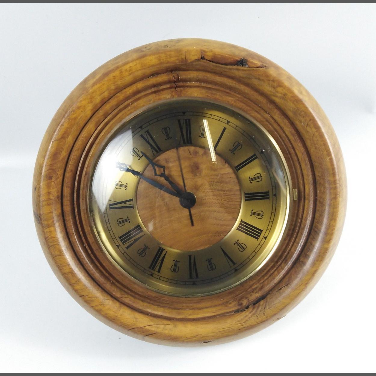 A hand-made GLENBARR solid wooden based clock from the Scottish Highlands with brass coloured face and Roman numerals approx 24cm dia.