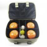 TOP QUALITY DRAKES PRIDE bowling bag with a set of four bowls VECTOR VS size 00 and three DRAKES PRIDE jacks, two white and one yellow