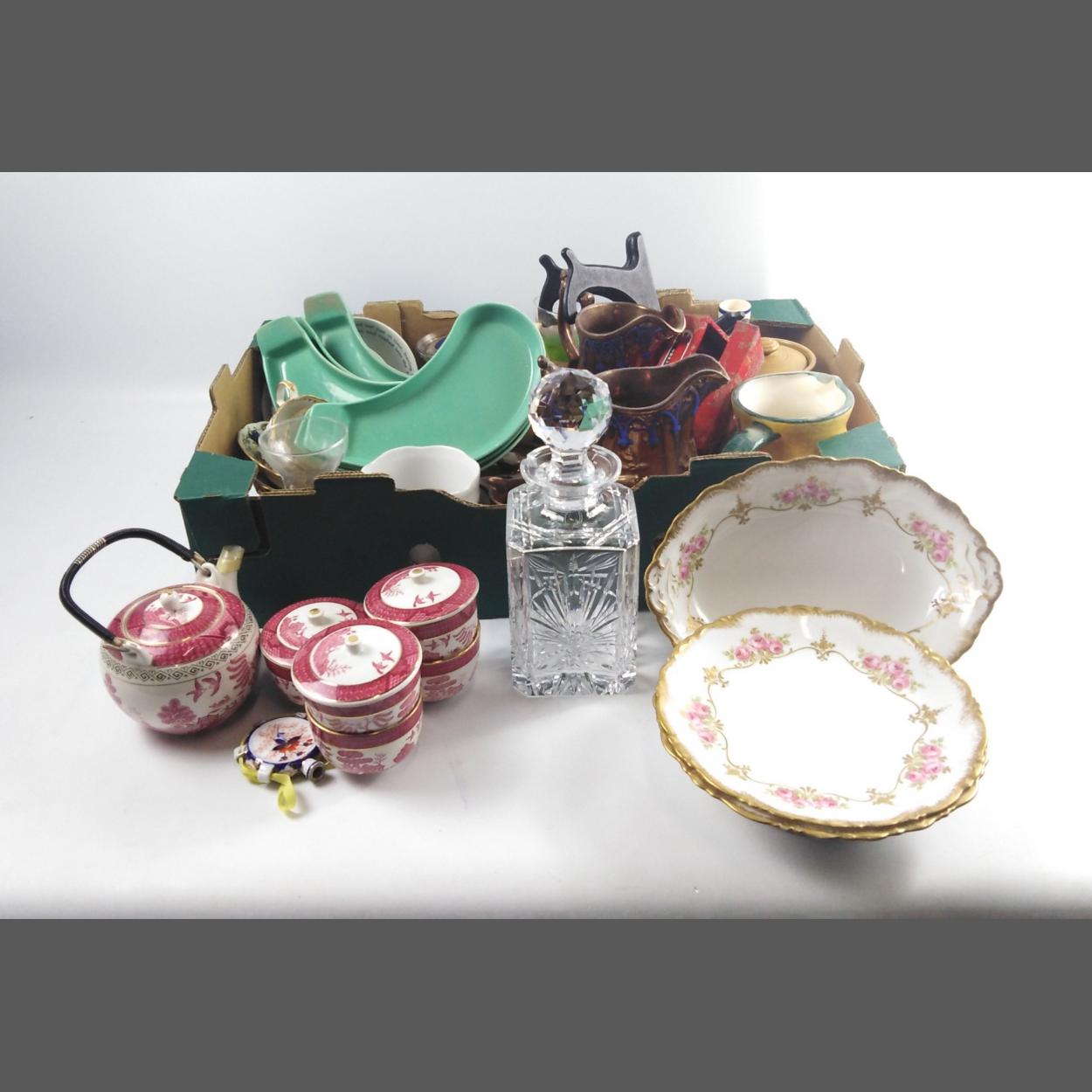 A large QUALITY mixed box FILLED with ceramic collectables to include a Chinese tea set with tea pot and cups, some lidded, a pair of copperised lustreware jugs, a crystal decanter with stopper, unusual moon shaped dishes by Green & Co, stoneware items, three rather nice LIMOGES raised plates and a bowl and much much more....