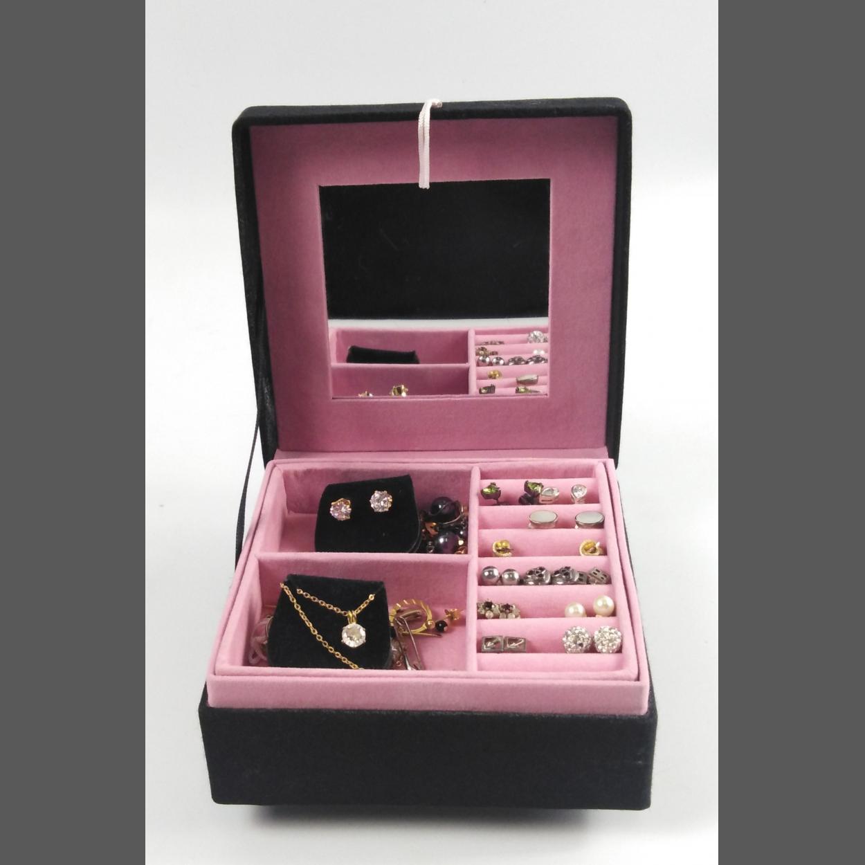 A nice wee jewellery lidded and internally mirrored small box 'FILLED with lots of pairs of earrings in 'yellow metal' and other metals, a nice 'yellow metal' pendant with chain, some really pretty pieces in here!