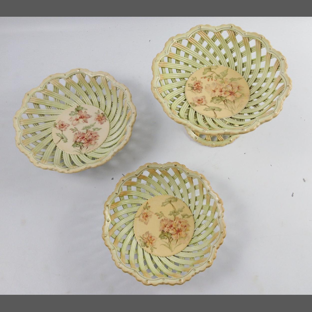 Three vintage Austrian ELBOGEN basketweave dishes with a floral design, 19cm, 22cm diameter plus 1 tazza 14cm and 22cm dia