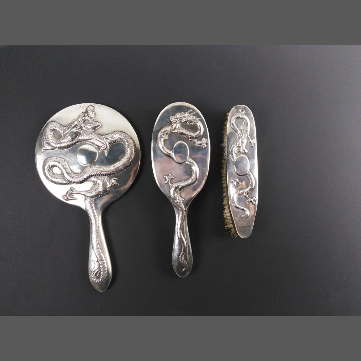 A BEAUTIFUL & SUBSTANTIAL ANTIQUE TRIO ORIENTAL Silver marked dressing table set in repousse DRAGON FORM design - Quite exquisite! to include two brushes and a large hand mirror (hand mirror) 27cm long x 17cm diameter, mirror has a tiny chip on the bevel edge- this came from a high ranking Hong Kong family home. (790g gross weight)