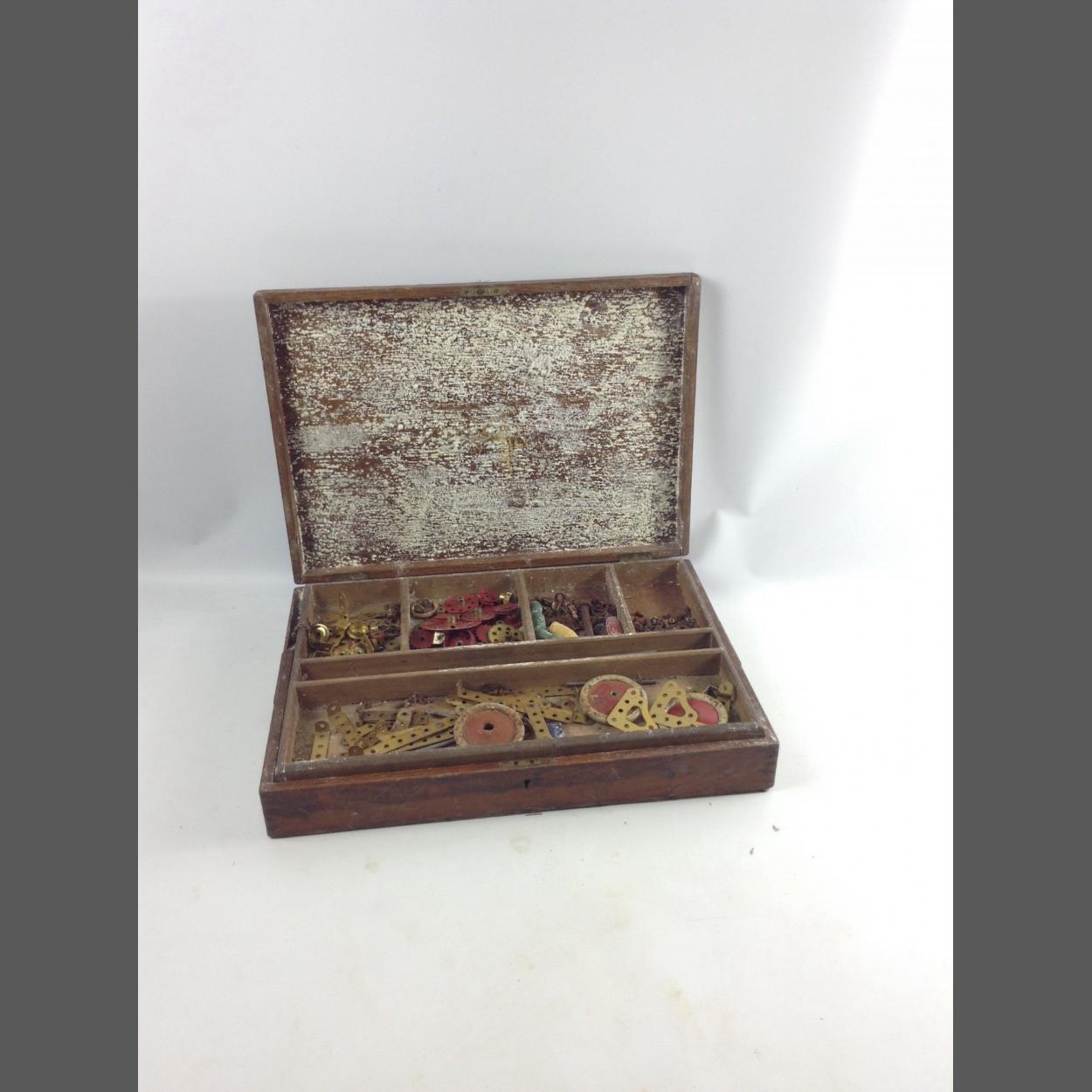 Original No.5 Meccano wooden box including insert tray with limited contents. Very poor condition (stored in damp conditions) but retains gilt lettering