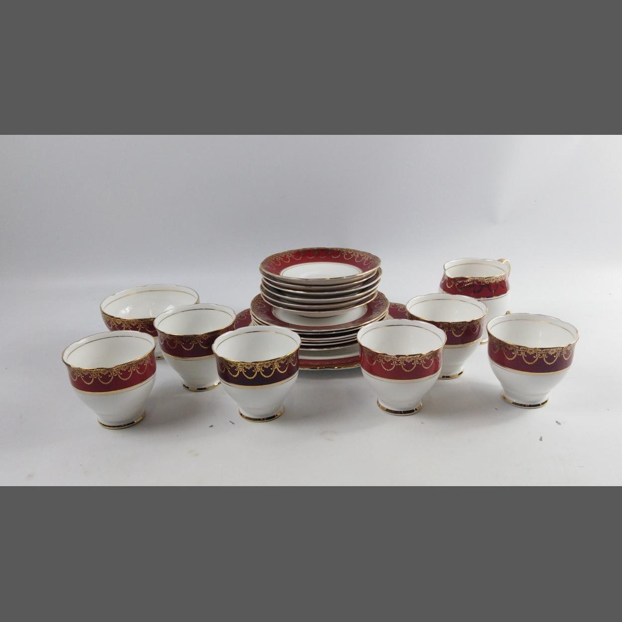 A vintage SALISBURY afternoon tea service in stunning ruby with gilt trim to include 6 cups, 6 saucers (14.5cm), 6 side plates (17cm), 1 milk jug, 1 sugar bowl and 1 cake plate (28cm)