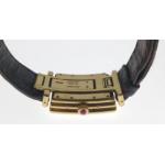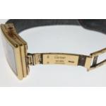An IMPRESSIVE CARTIER 18k/750 quartz stamped tank WRIST WATCH with leather strap(no paperwork or box with watch) serial No 139675 on the back plate of the watch, with a ruby cabouchon winder, its face has Roman Numerals depicted at four quarters -weight 51g gross - Case measurement 22mm x 28mm, face measurement 17mm x 23mm, minute hand is 6mm and hour hand is 4mm.