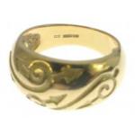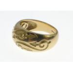 STUNNING! 750 stamped yellow gold RING with scrolled engraving, ring size O, weight 9.10g approx (matches previous lot his and hers etc)