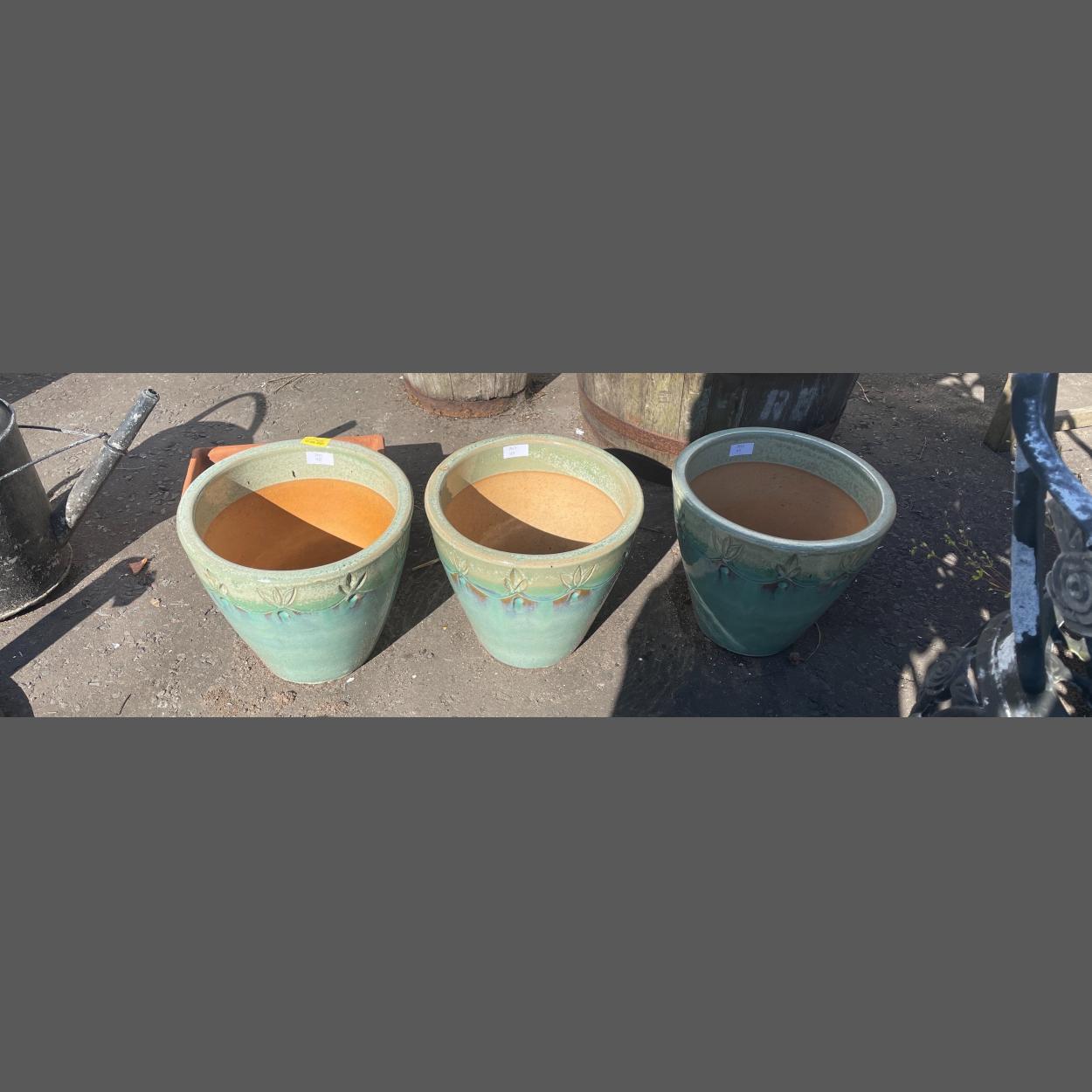 Three matching mottled green drip glaze garden planters with tri-leaf etching