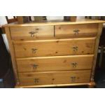 Pine set of 2 over 3 drawers with ornate brass handles and column design